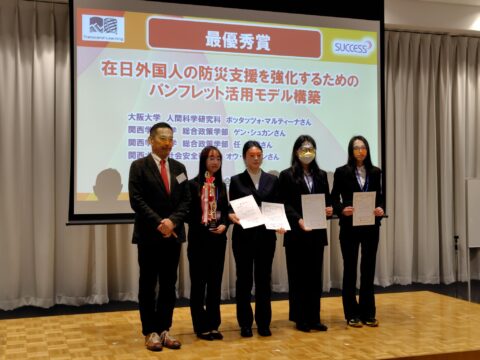 コンテストは一般社団法人「Transcend-Learning」が産官学と連携し、外国人留学生のアイデアをビジネス創出に結びつけるもので、12月5日に関西大学梅田キャンパスで開催されました。同大や大阪大の教授ら、有識者からなる審査員からは、防災情報を留学生ならではの視点でシンプルに再編集した点に加え、行政や自治体、観光拠点での具体的な配布などが進みつつある点が評価されました。